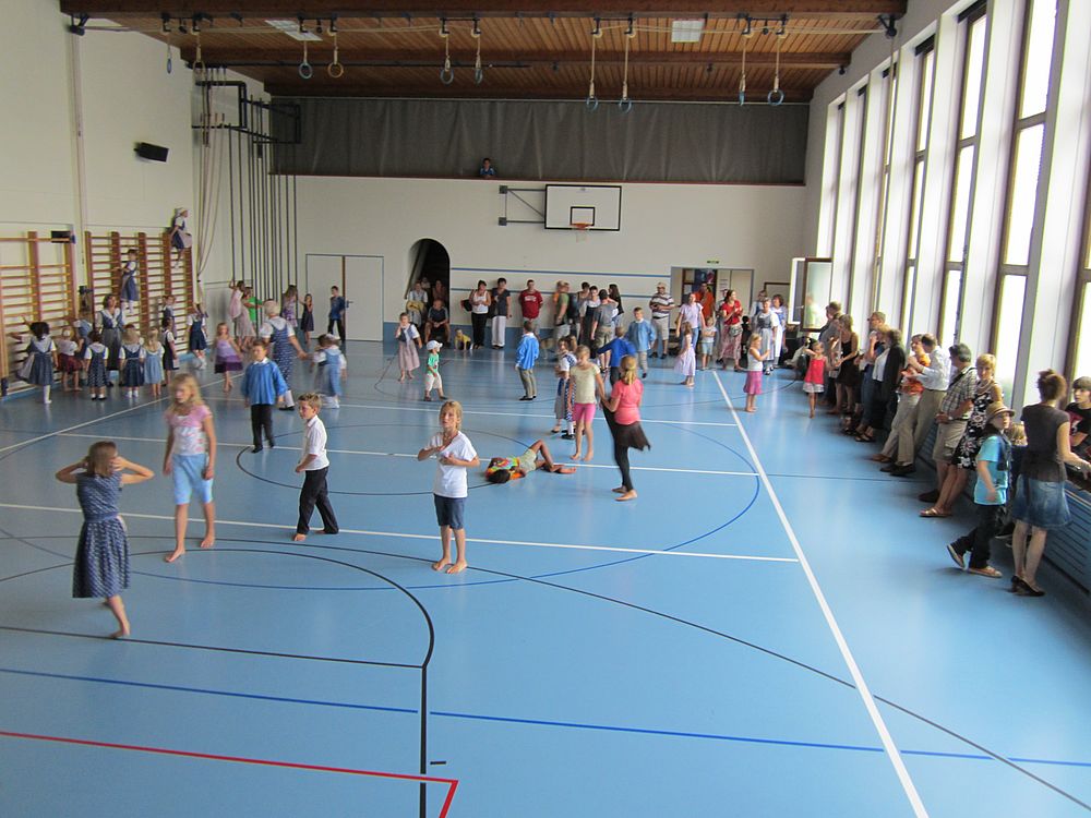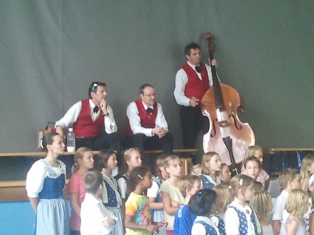 Gegen halb fünf kamen dann die einzelnen Gruppen von ihren Übungsräumen wieder zurück. Aber es war noch lange nicht fertig. Ein gemeinsamer Abschluss mit Vorführung durfte natürlich nicht fehlen. Jede der drei Gruppen zeigte einen Tanz vor, den sie in den Workshops am Nachmittag einstudiert haben. Mit zwei ebenfalls am Nachmittag einstudierten Liedern ging dann dieser Nachmittag zu Ende. Schade war nur, dass es gegen Abend nicht mehr so viele Sonnenstrahlen hatte, sondern bereits viele Regentropfen. Die Abschlussvorführung fand deswegen in der Turnhalle statt. Aber wem spielt das schon eine Rolle, wenn man dafür gemeinsam tanzen und singen kann?!?