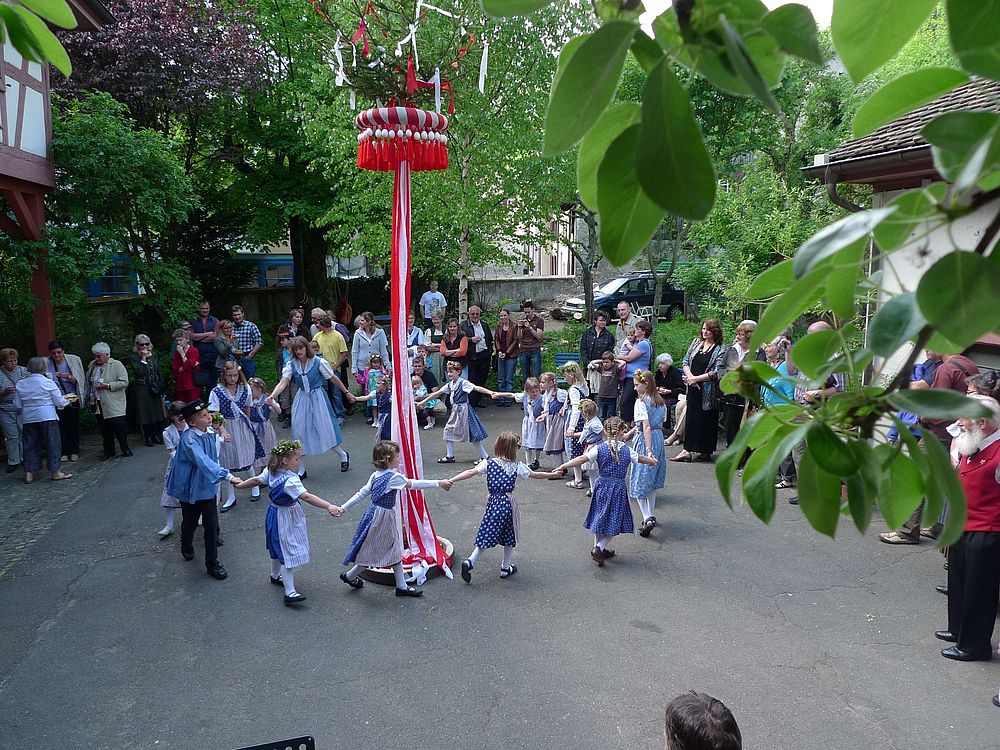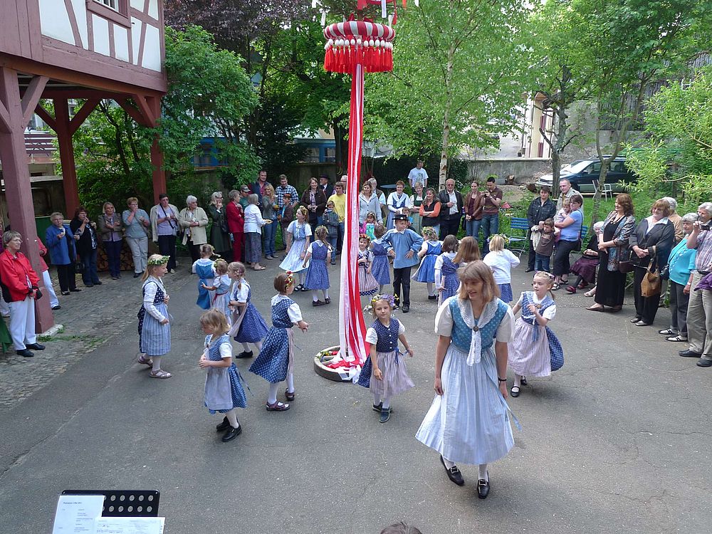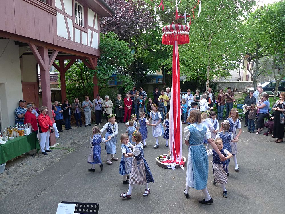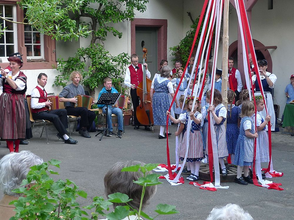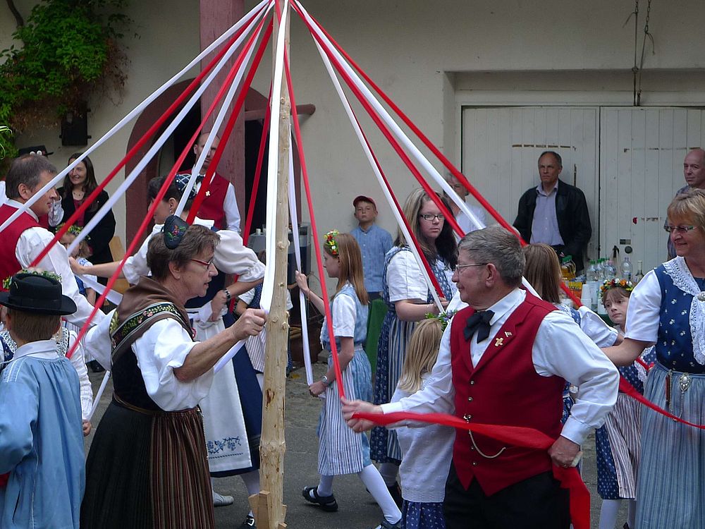 Anschliessend an den Gottesdienst fand im Pfarrgarten das Maitanzen statt. Die Erwachsenen tanzten , die Kinder tanzten , mal wurde zusammen getanzt, dann wurde gesungen und zu guter Letzt wurde noch der Maibaum mit den Kindern und Erwachsenen zusammen dargeboten.
