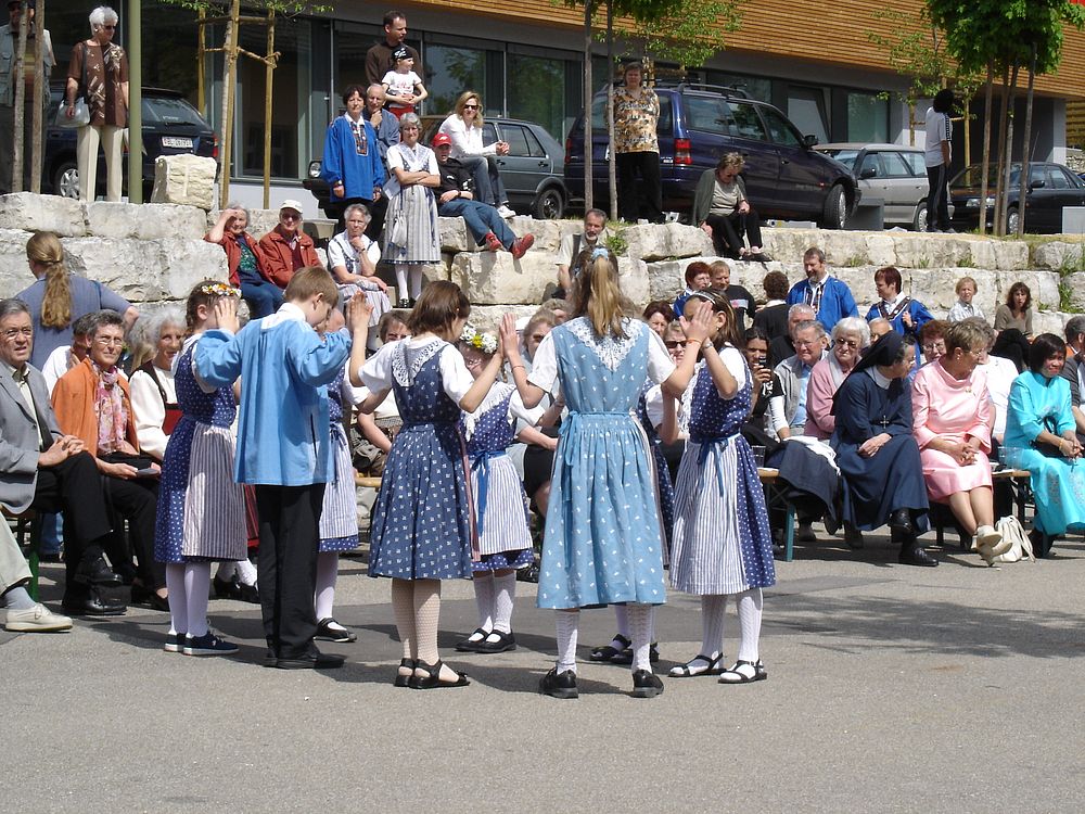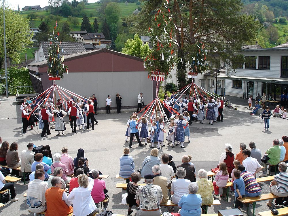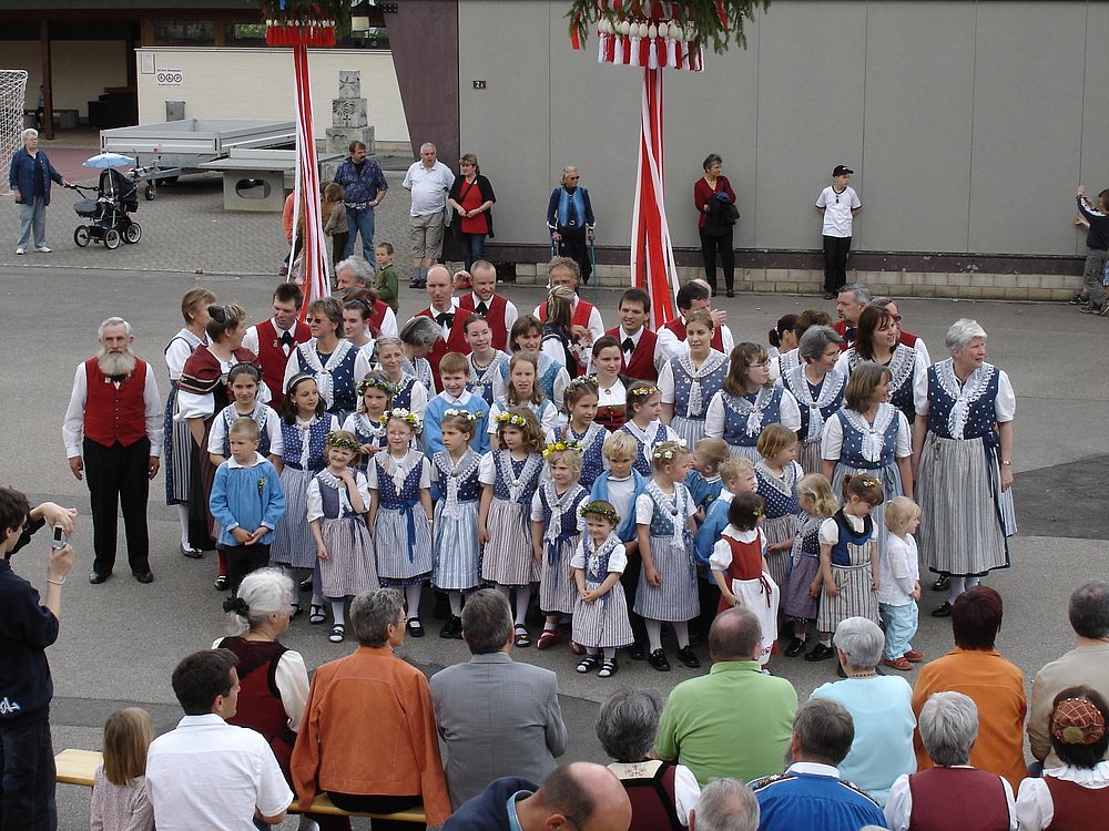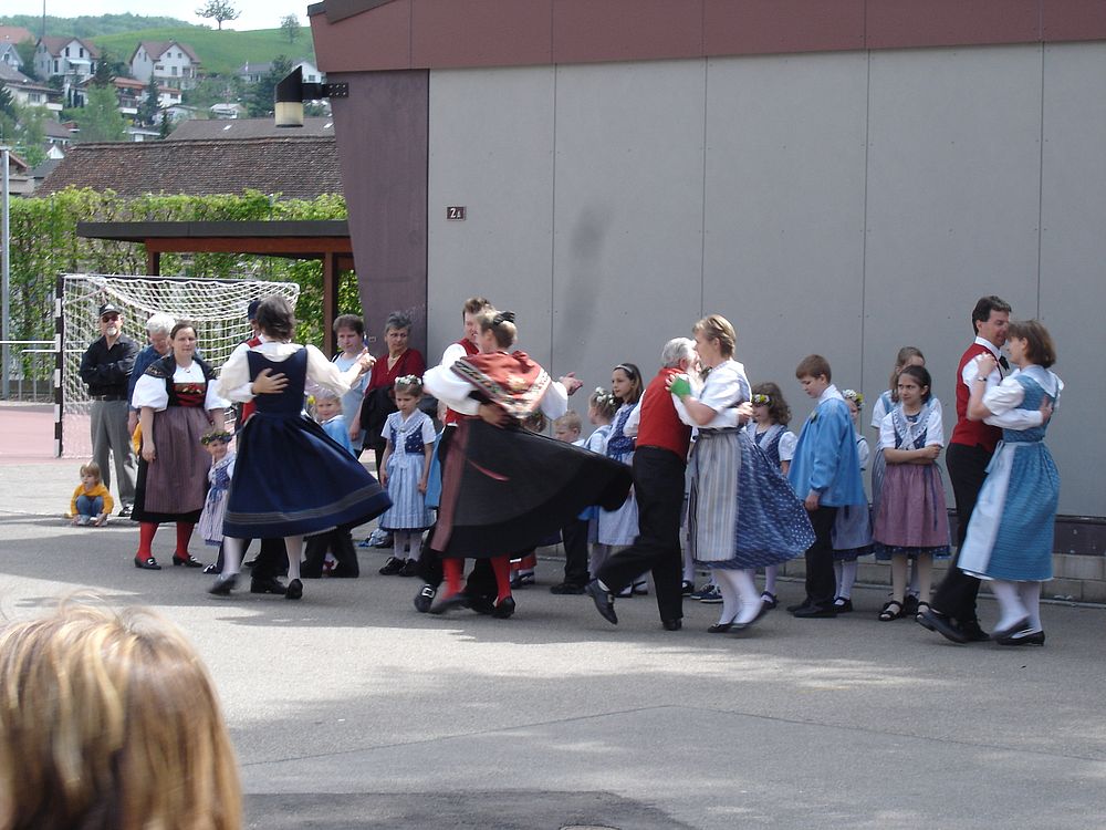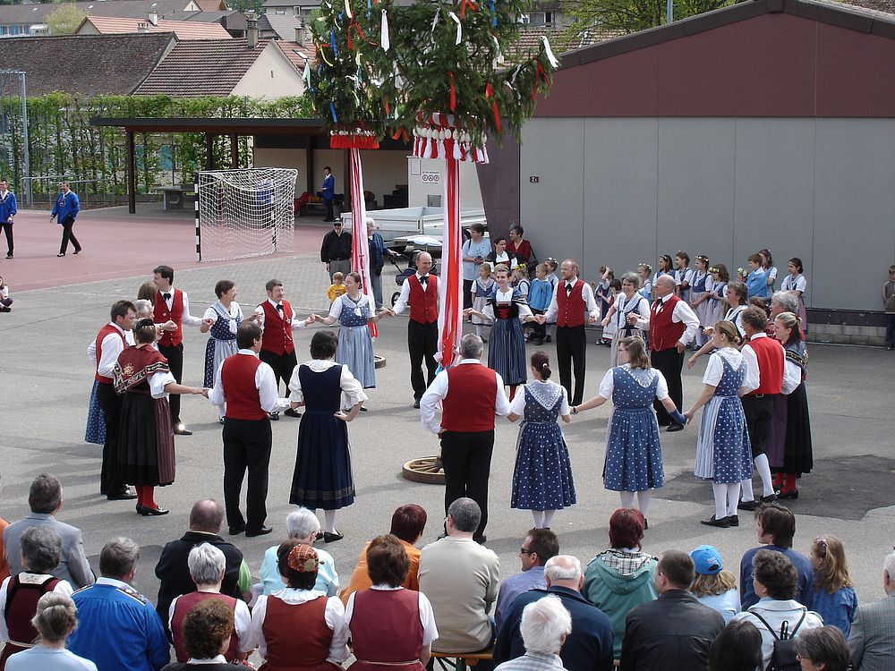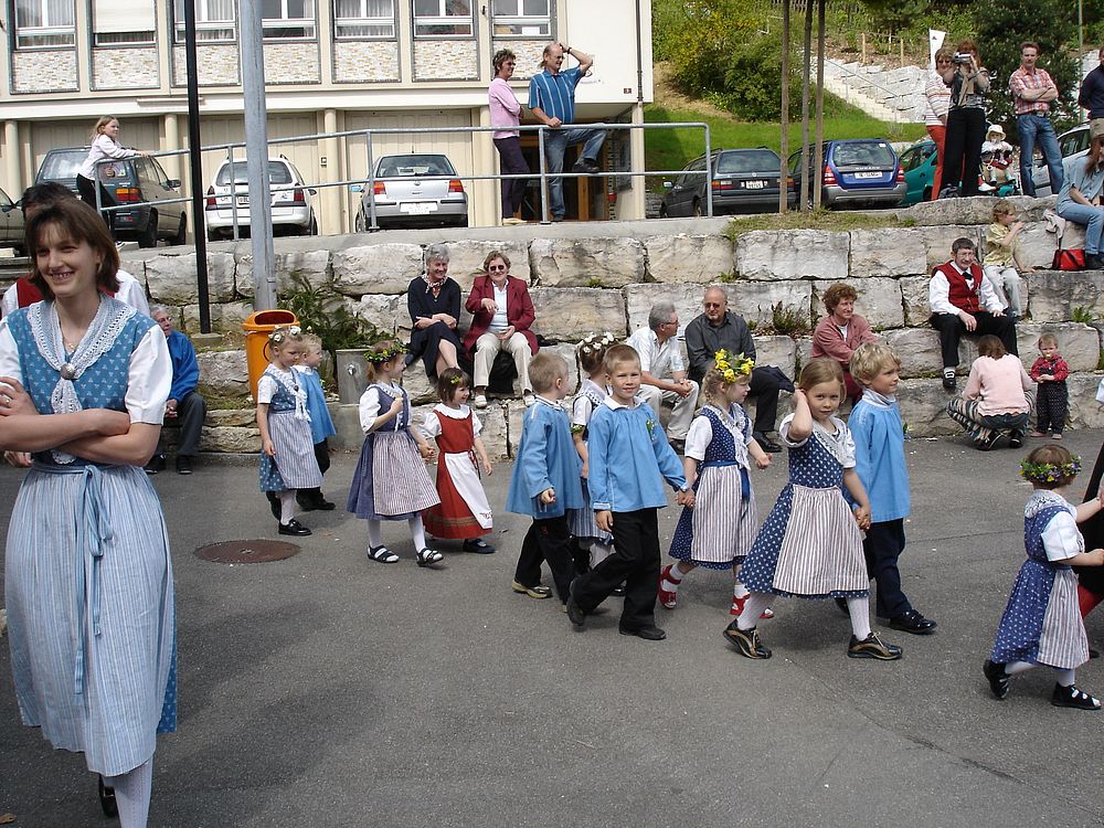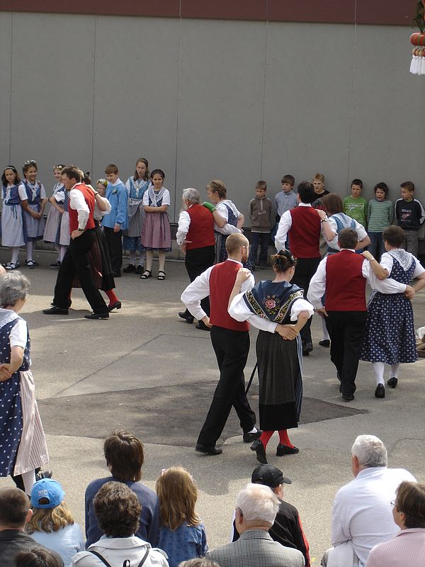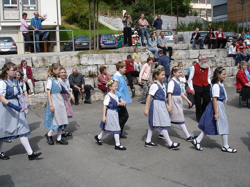 Um 10 Uhr begann der ökumenische Gottesdienst auf dem Pausenplatz der Primarschule Niederdorf. Das Trachtenchörli bereicherte diesen mit vier Liedern. Um 11 Uhr ging’s mit Beiträgen der Tanzgruppen weiter. Die Erwachsenen tanzten unter anderem den ‚Chirsipfäffer’ als Umzugstanz und ‚Capricorn’. Die Kinder zeigten neben anderen ‚Kegelkönig’ und ‚Knopfloch’. Den Bändertanz tanzten wir an zwei Erwachsenen- und einem Kinderbaum. Durch das ganze Programm wurden wir musikalisch von Simon Dettwiler und seinen Musikanten begleitet. Zum Abschluss des Vormittagsprogramms sangen alle Anwesenden zusammen das Baselbieterlied.