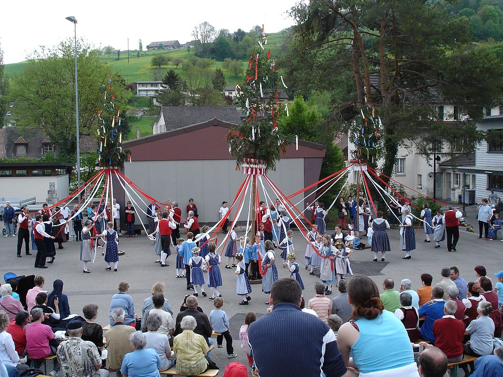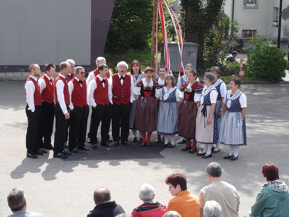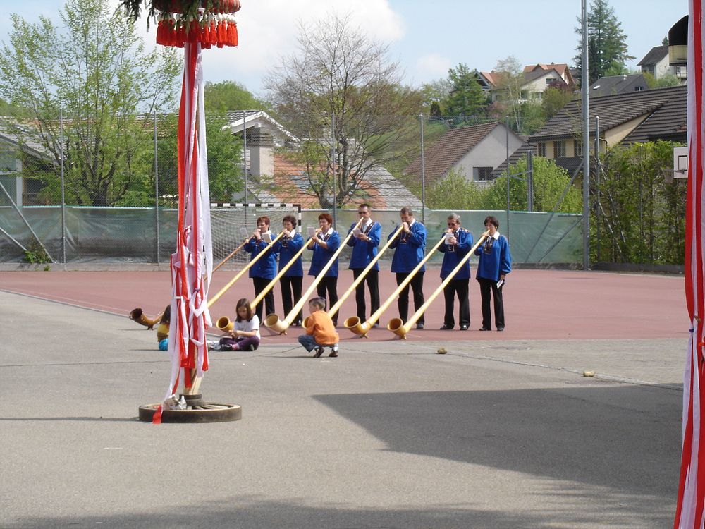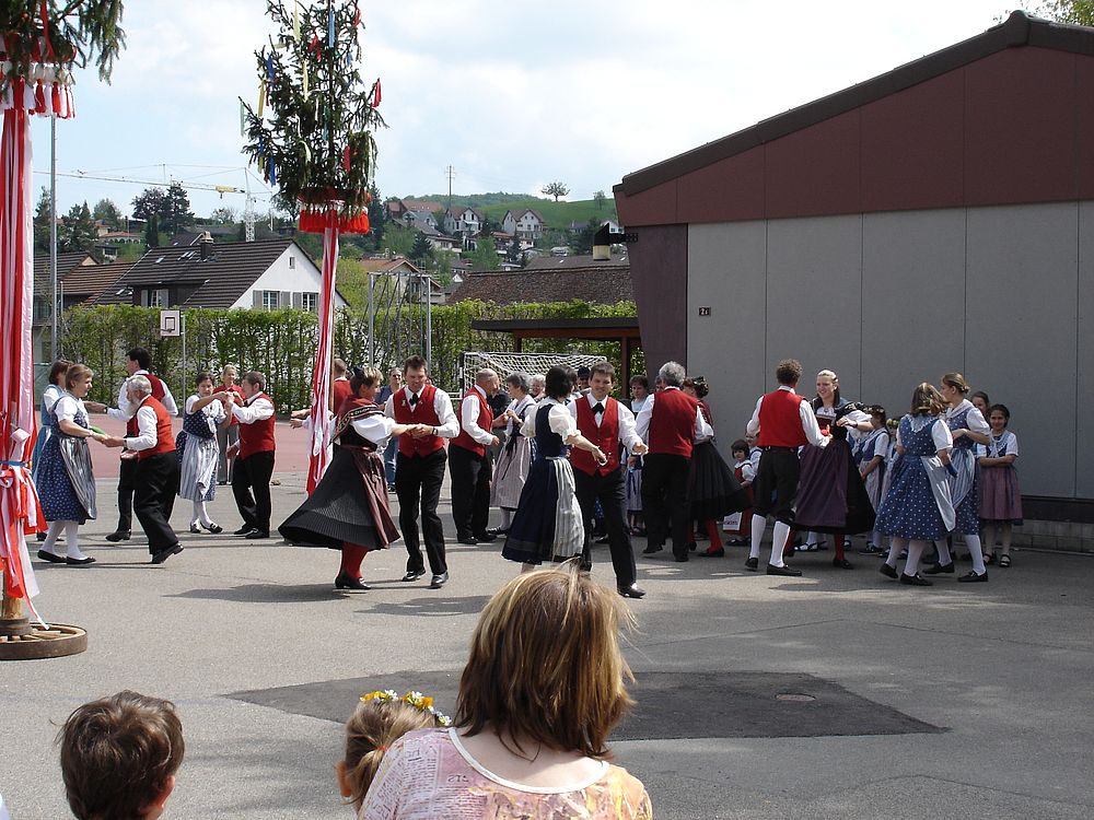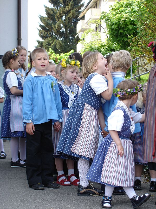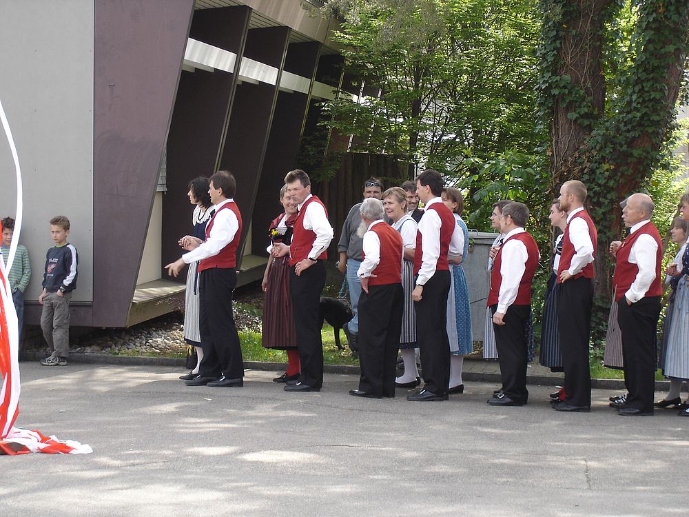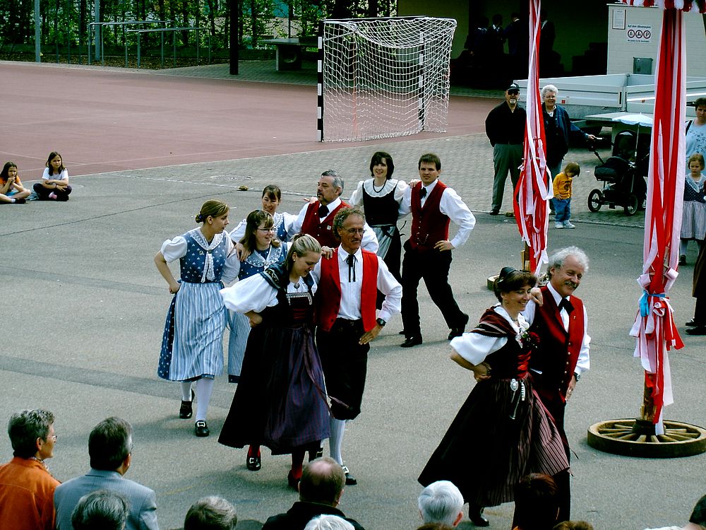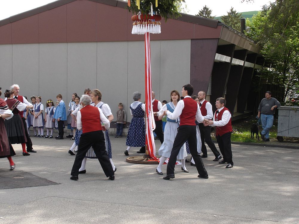 Um 10 Uhr begann der ökumenische Gottesdienst auf dem Pausenplatz der Primarschule Niederdorf. Das Trachtenchörli bereicherte diesen mit vier Liedern. Um 11 Uhr ging’s mit Beiträgen der Tanzgruppen weiter. Die Erwachsenen tanzten unter anderem den ‚Chirsipfäffer’ als Umzugstanz und ‚Capricorn’. Die Kinder zeigten neben anderen ‚Kegelkönig’ und ‚Knopfloch’. Den Bändertanz tanzten wir an zwei Erwachsenen- und einem Kinderbaum. Durch das ganze Programm wurden wir musikalisch von Simon Dettwiler und seinen Musikanten begleitet. Zum Abschluss des Vormittagsprogramms sangen alle Anwesenden zusammen das Baselbieterlied.