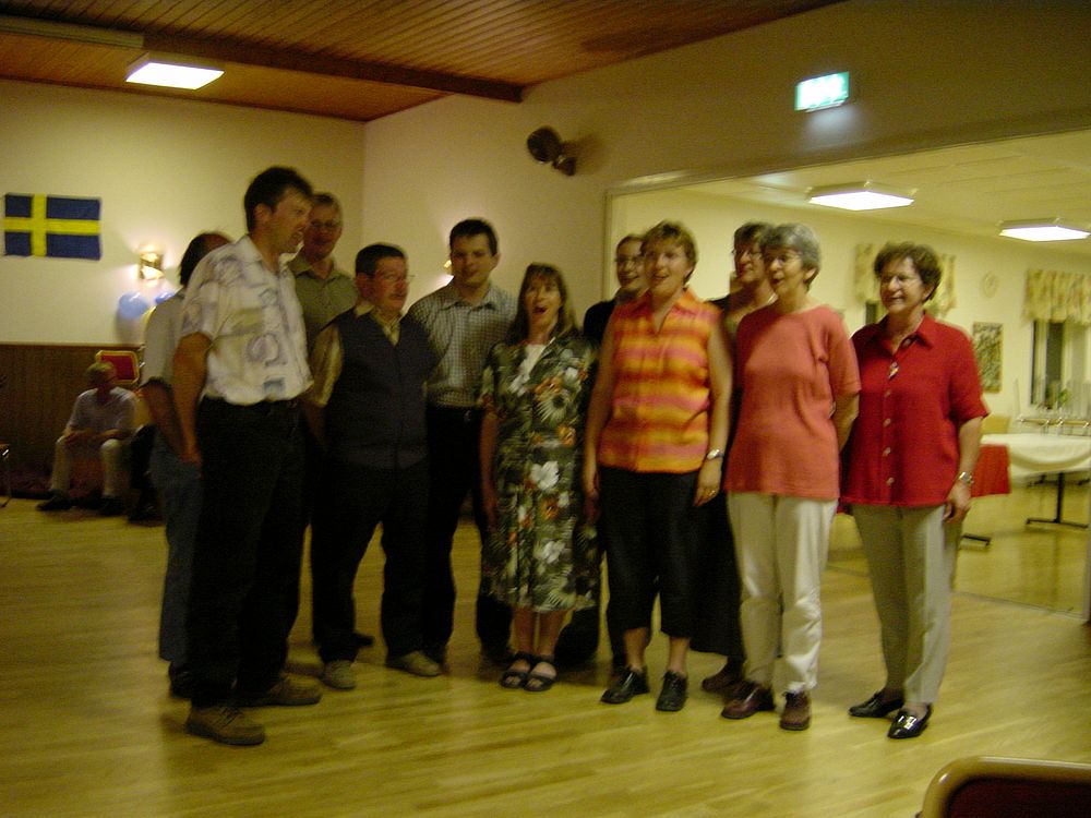 Zu den gemeinsamen Ausflügen gehörte zum Beispiel der Besuch einen Tierparks (inkl. Elch), eines Heimatparkes mit einer Dampfmaschinenausstellung oder der Besuch eines modernen Hofes mit 100 Milchkühen. Auf diesem Hof mussten wir Schweizer uns mit Haarnetzen und Schutzmänteln wie Aliens be- oder verkleiden, da wir nicht aus einem EU-Land kommen. Auf allen gemeinsamen Ausflügen nahmen die Gastfamilien immer ein sehr reichhaltiges Picknick mit. Alle Picknicks waren immer sehr amüsant. Leider mussten wir oft unters Dach flüchten, da es viel regnete und es kalt war. Doch das Highlight war unser einziger Auftritt vor der Kirche von V.Vram. Unsere Musik, die Familienkapelle Vadret aus Davos, das Chörli, die schwedische Musik sowie die schwedische Trachtengruppe zeigten schöne Darbietungen in der Kirche. Doch leider kamen sehr, sehr wenige Besucher, da der Auftritt unter der Woche schon um 18 h stattfand. Wir zeigten anschliessend auch noch einige Tänze. Zuerst nur die TGW, dann mit den Schweden zusammen. An einem Abend und an der Abschlussparty tanzten wir gemeinsam mit den Schweden abwechslungsweise Schweizer- und Schwedentänze. An der Abschlussparty gab es ein grosses Buffet und zum Dessert zwei riesige Schwedentorten. Doch leider war der Schlussabend schon relativ früh zu Ende (ca.23.30 h), für einige zu früh …