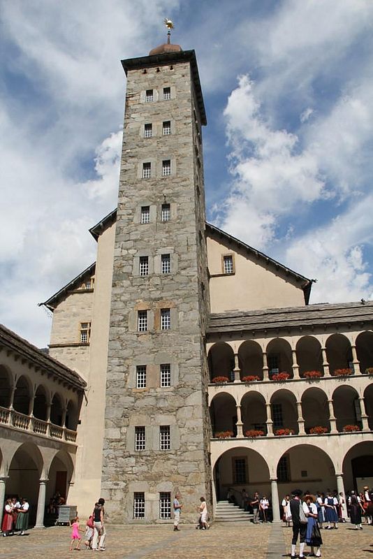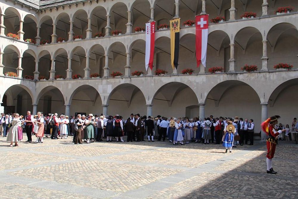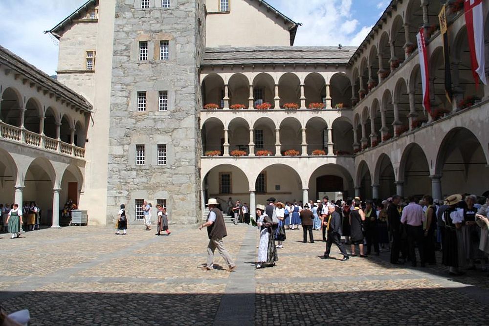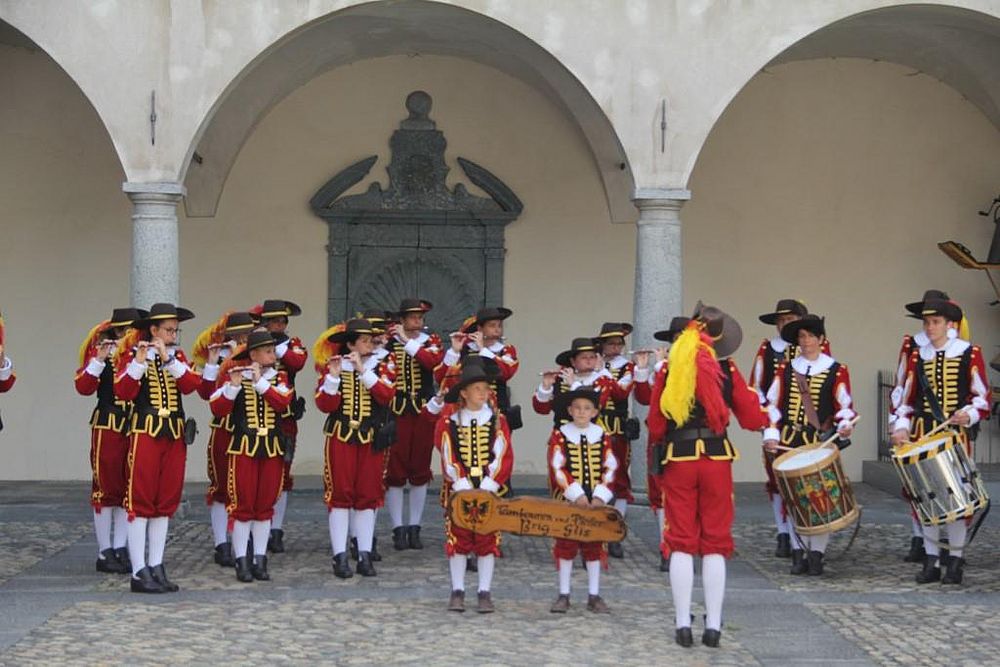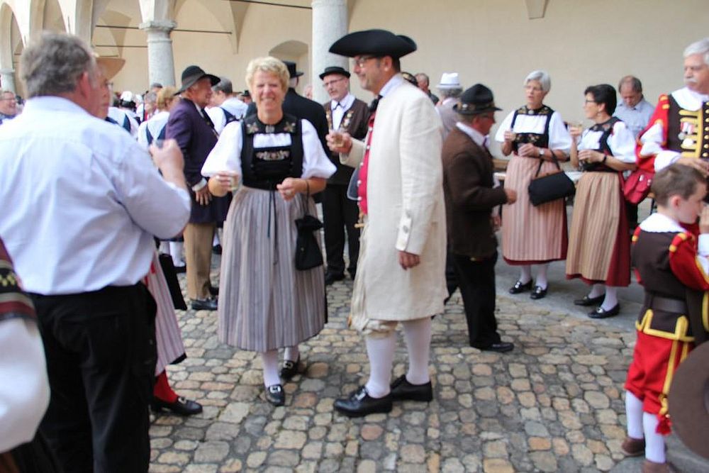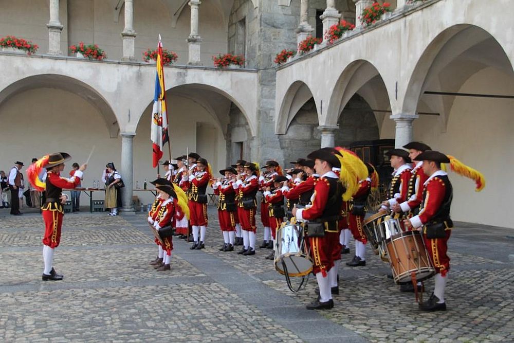 Apéro im Innenhof des Stockalperschlosses, mit Weisswein und Wasser, musikalisch untermalt von den Tambouren und Pfeiffern Brig-Glis