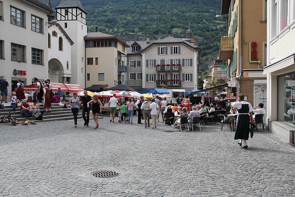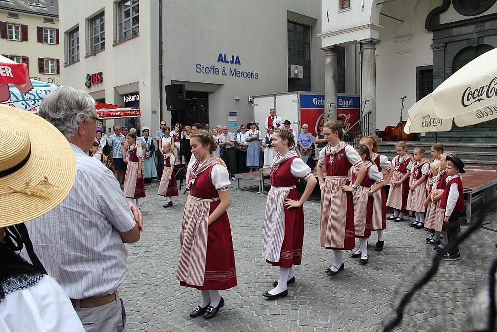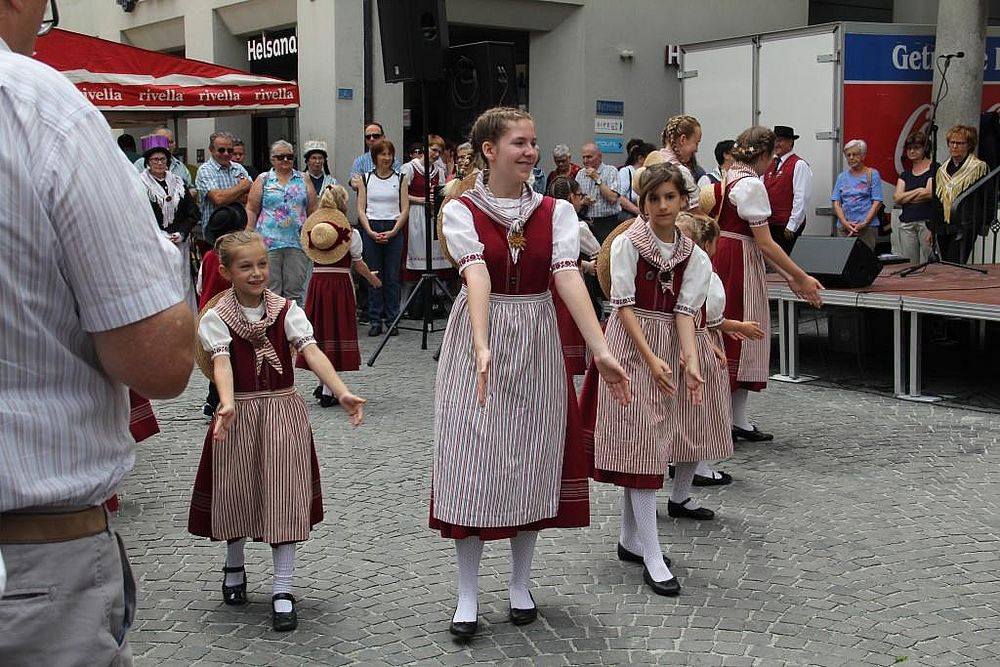 Samstag über die Mittagszeit: Festlicher Betrieb auf dem Sebastiansplatz, u.a. mit einer Walliser Kindertanzgruppe.