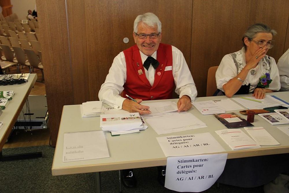 Ab 14 Uhr Delegiertenversammlung im Pfarreizentrum Brig. Sämi und Margrit Benz helfen mit, während Baselbieter und andere Delegierte der kommenden Dinge harren.