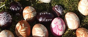 Diese werden am Dienstag vor Gründonnerstag kunstvoll mit Blättern und Gräsern in Strümpfe eingepackt und mit farbigen Hölzern oder Zwiebelschalen gekocht und zu Kunstwerken verarbeitet.
